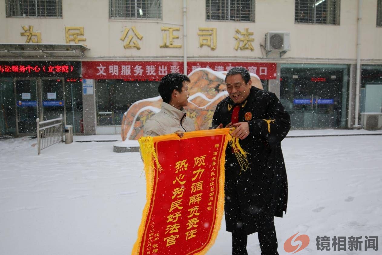 2月2日上午,一起抚养费纠纷案件原告的法定监护人汪某冒着鹅毛大雪来到西峡法院将一面印有“倾力调解负责任 热心为民好法官”的锦旗送到承办法官及其书记员手中,对法官倾心化解纠纷,护佑儿童成长表达感谢之情。