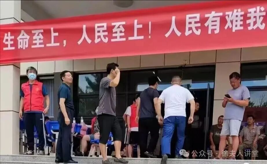 这张图片就是新乡河师大附中灾民安置点,我给他们送去了两车蔬菜,穿白上衣那个胖子就是于哥,前面引路的黑衣男子是该校校长。