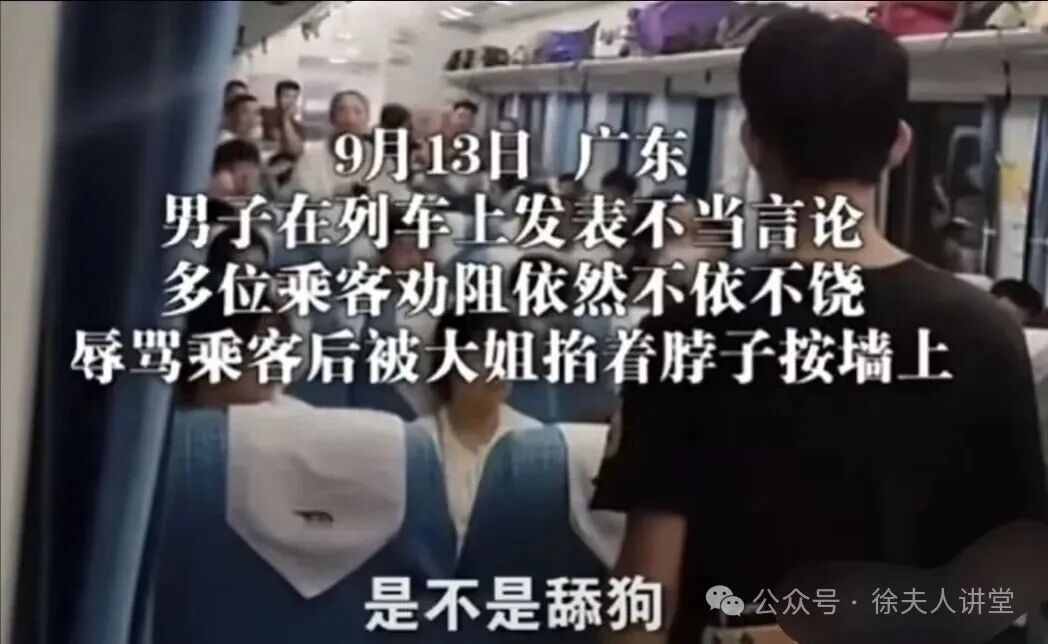 网传一段视频显示,一名男子在列车上被一名女子锁住脖子。据说那名男子发表不当言论,被女子跑到跟前用一只手卡着脖子推到车厢上,至于那名男子说了什么,网上也没有人知道。